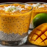 J’ai fait ce pudding de chia à la mangue et au lait de coco pendant les matins d’été quand je voulais un dessert frais mais facile à préparer. C’est un dessert (ou petit-déjeuner) crémeux, léger et parfumé : la richesse du lait de coco se marie à la douceur juteuse de la mangue et à la fraîcheur du citron vert. Parfait pour préparer la veille, emporter au travail ou servir en verrines colorées pour un brunch.