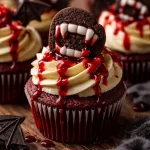 Rapide, visuel et terriblement gourmand : ces cupcakes combinent un chocolat moelleux avec des éclats de chocolat croquants et un glaçage rouge qui donne tout son caractère "morsure de vampire". Ils se font en une seule fournée, demandent peu d’ingrédients courants, et la décoration s’adapte à tous les niveaux — des enfants peuvent aider à poser les yeux en bonbon.
