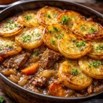 J’ai toujours un faible pour les plats qui sentent la maison — et le Lancashire hotpot en fait partie. C’est un ragoût d’agneau rustique, recouvert de fines tranches de pommes de terre, lentement mijoté jusqu’à ce que la viande soit fondante et les pommes de terre dorées. Idéal pour les soirées fraîches, les repas en famille ou quand vous voulez un plat réconfortant sans complications techniques.