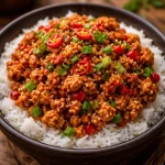 J’ai commencé à faire ce poulet haché épicé un soir de semaine quand le frigo criait “vide” — en dix minutes j’avais un plat savoureux, parfumé et compatible avec riz ou wraps de laitue. C’est une recette simple mais pleine de caractère : la pâte de chili apporte du piquant, la sauce soja une note umami, et le poivron ajoute de la fraîcheur. Parfaite pour un dîner rapide, pour garnir des tacos de laitue ou pour utiliser du poulet haché que vous avez déjà sous la main.